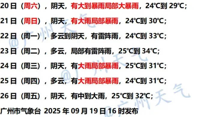 广州市时局台展望,受台风“米娜”影响,9月20日至21日广州有暴雨局部大暴雨,间中伴有短时大风、短时强降水、雷电等强对流天气,高温缓解;广州港区风力8~10级,陆地风力6~9级。